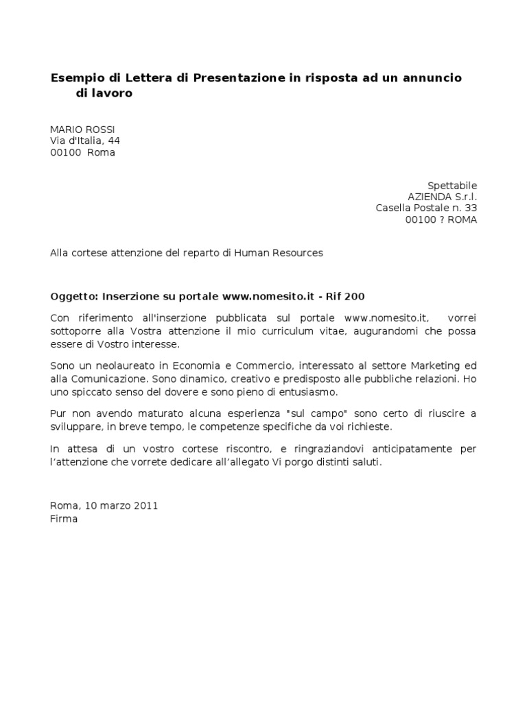 Lettera di Presentazione: 15 Accurati Esempi Per Trovare ... Mar 13, 2016 · Lettera di Presentazione, CV Neolaureato. Ho ricevuto personalmente questa candidatura, che sicuramente non è la lettera di presentazione più elegante della storia, ma mi ha molto incuriosito perché lasciava trasparire produttività, voglia di fare, di imparare, di crescere. Ho colloquiato la risorsa 24 ore dopo e assunta il giorno dopo ...