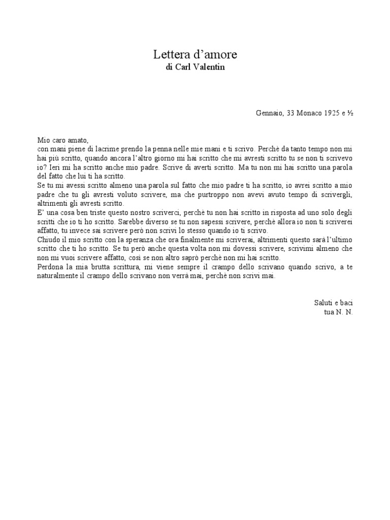 Lettera d amore karl valentin pdf. Romanticismo - Wikipedia Origine del termine. Il termine "Romanticismo" deriva dall'inglese romantic (da romance, traducibile in italiano come «romanzesco», nel senso di «non reale»), che nella metà del XVIII secolo indicava quei generi letterari, come i romanzi cavallereschi, che rappresentavano vicende fantastiche all'interno di un'ambientazione storica più o meno accurata. Johann Strauss (figlio) - Wikipedia Grazie a questa lettera, Johann Strauss riuscì ad avere la meglio su ogni resistenza e, il 7 ottobre 1849, per la prima volta, diresse l'orchestra che era stata del padre nel salone del Volksgarten e il successivo 11 ottobre salì nuovamente sul podio del complesso per dedicare al genitore scomparso il Requiem di Mozart. Nonostante alcune ... Marcel Proust - Wikipedia Marcel Proust nel 1900. Valentin Louis Georges Eugène Marcel Proust ([ˈprust]; in francese: [maʁsɛl pʁust]; Parigi, 10 luglio 1871 – Parigi, 18 novembre 1922) è stato uno scrittore, saggista e critico letterario francese, la cui opera più nota è il monumentale romanzo Alla ricerca del tempo perduto (À la recherche du temps perdu) pubblicato in sette volumi tra il 1913 e il 1927. Progetto:Persecuzioni, deportazioni e crimini del periodo ... Sottoprogetto del principaleːProgetto:Persecuzioni, deportazioni e crimini del periodo nazi-fascista riguardante il tema del Negazionismo dell'Olocausto nei diversi caratteristici aspettiː la ricerca, l'analisi, la categorizzazione dei diversi processi che nel dopoguerra riguardarono tutti gli ispiratori e gli esecutori dello sterminio perpetrato nell'Olocausto.