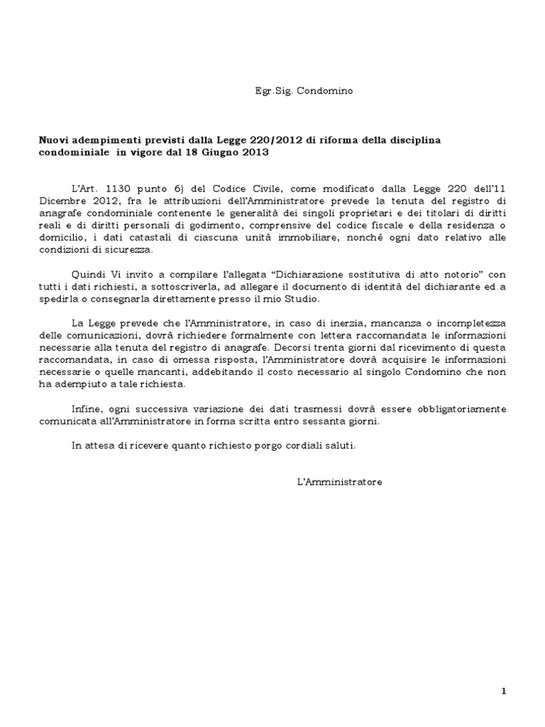 Lettera di assunzione dell'incarico di amministratore Con l'occasione si invitano i sigg. condomini ad effettuare qualsiasi comunicazione o richiesta, inerenti l'amministrazione dei beni comuni, direttamente al sottoscritto presso i sotto indicati recapiti professionali. Si allega, per gli effetti di legge, copia del verbale della suddetta deliberazione. Con l'occasione mi è gradito porgere Fac Simile Lettera all'Amministratore di Condominio per Infiltrazioni Il modulo lettera all'amministratore di condominio per infiltrazioni compilabile messo a disposizione è in formato DOC, può quindi essere aperto e compilato utilizzando Word o un altro programma che supporta questo formato. La compilazione è molto semplice, basta infatti inserire i dati mancanti negli spazi presenti nel documento. Lettera richiesta intervento amministratore condominio Lettera all'amministratore Il testo ufficiale è quello che appare pubblicato nei documenti ufficiali del Governo di Porto Rico, da consultare in caso di dubbi sul testo qui condiviso. Per scaricare una copia di questa legge, cliccare QUI. L'amministratore di condominio - Altalex Sep 03, 2020 · L'amministratore è obbligato a far transitare le somme ricevute a qualunque titolo dai condomini o da terzi, nonché quelle a qualsiasi titolo erogate per conto del condominio, su uno specifico ...