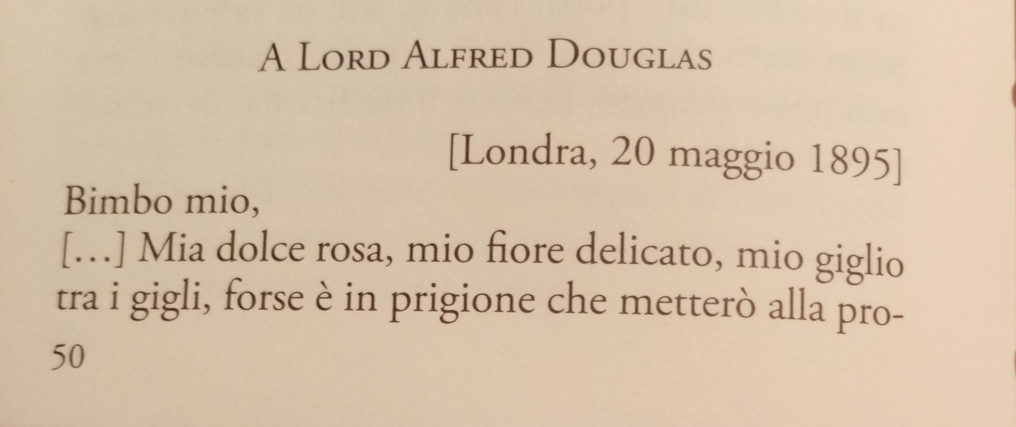 Le lettere di Oscar Wilde all'amato Alfred Douglas Il 29 aprile di quell'anno, dopo aver toccato il fondo sul piano emotivo e psicologico, la sua reputazione fu rovinata, e la sua salute compromessa. Wilde scrisse a Douglas alla vigilia del processo finale: Mio carissimo ragazzo, questa lettera è per assicurarti del mio immortale, eterno amore per te.