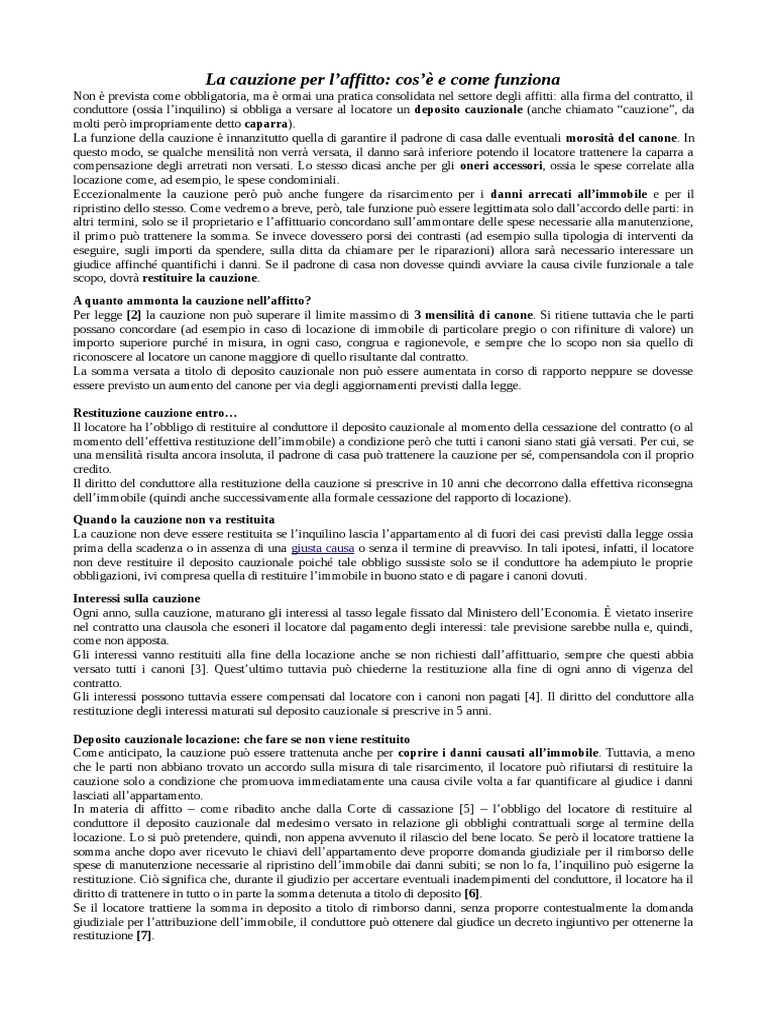 Richiesta restituzione caparra affitto - La Legge per Tutti Indicheremo, innanzitutto, le condizioni che legittimano il locatore a trattenere il cosiddetto " deposito cauzionale " o cauzione; poi, parleremo delle spese di riparazione che competono all'affittuario. Infine, presenteremo un modulo con facsimile con la richiesta restituzione caparra affitto. Ma procediamo con ordine. Indice