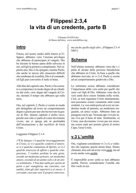 Lettera ai Filippesi - gaz.wiki L' Epistola ai Filippesi , comunemente indicata come Filippesi , è un'epistola paolina del Nuovo Testamento della Bibbia cristiana . L' epistola è attribuita all'apostolo Paolo e Timoteo è nominato con lui come coautore o co-mittente. La lettera è indirizzata alla chiesa cristiana di Filippi . [1] PDF Lettera Filippesi - Movimento Apostolico Lettera Filippesi - Movimento Apostolico Una perfezione non ancora raggiunta Filippesi 3,8-14 Il brano scelto dalla liturgia è ricavato dal capitolo 3 della lettera ai Filippesi: in esso Paolo, interrompendo lo sviluppo dei temi che stava affrontando ... Parole Nuove - Commenti al Vangelo - Commento su Fil 3,8-14 ... In questa lettera Paolo si difende di fronte a un gruppo di predicatori che erano arrivati a Filippi e avevano convinto i credenti che per abbracciare la fede in Cristo dovevano passare prima attraverso la fede del popolo ebreo e farsi dunque circoncidere.